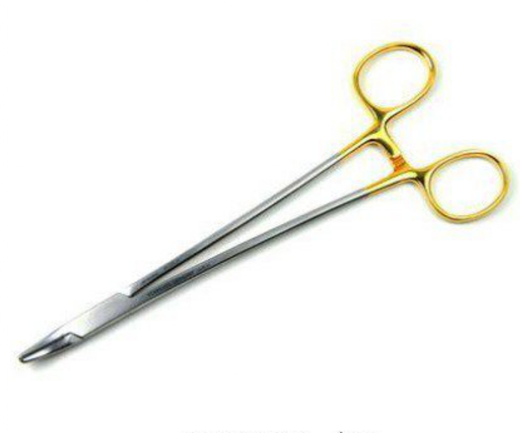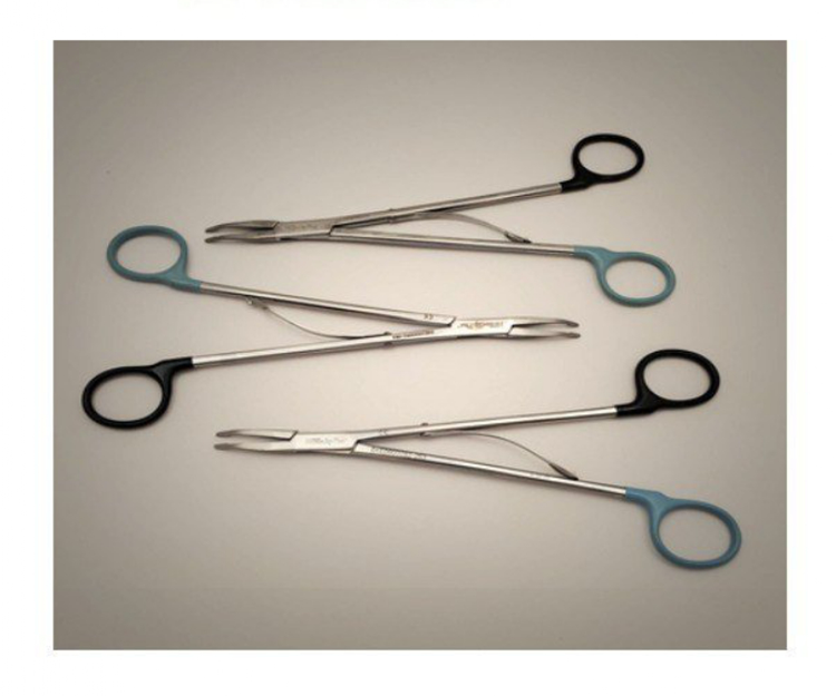 The heaney needle holder uses ratcheted blades for medium weight suturing. This holder can just as well be used as a cardiovascular approximation and closure instrument.